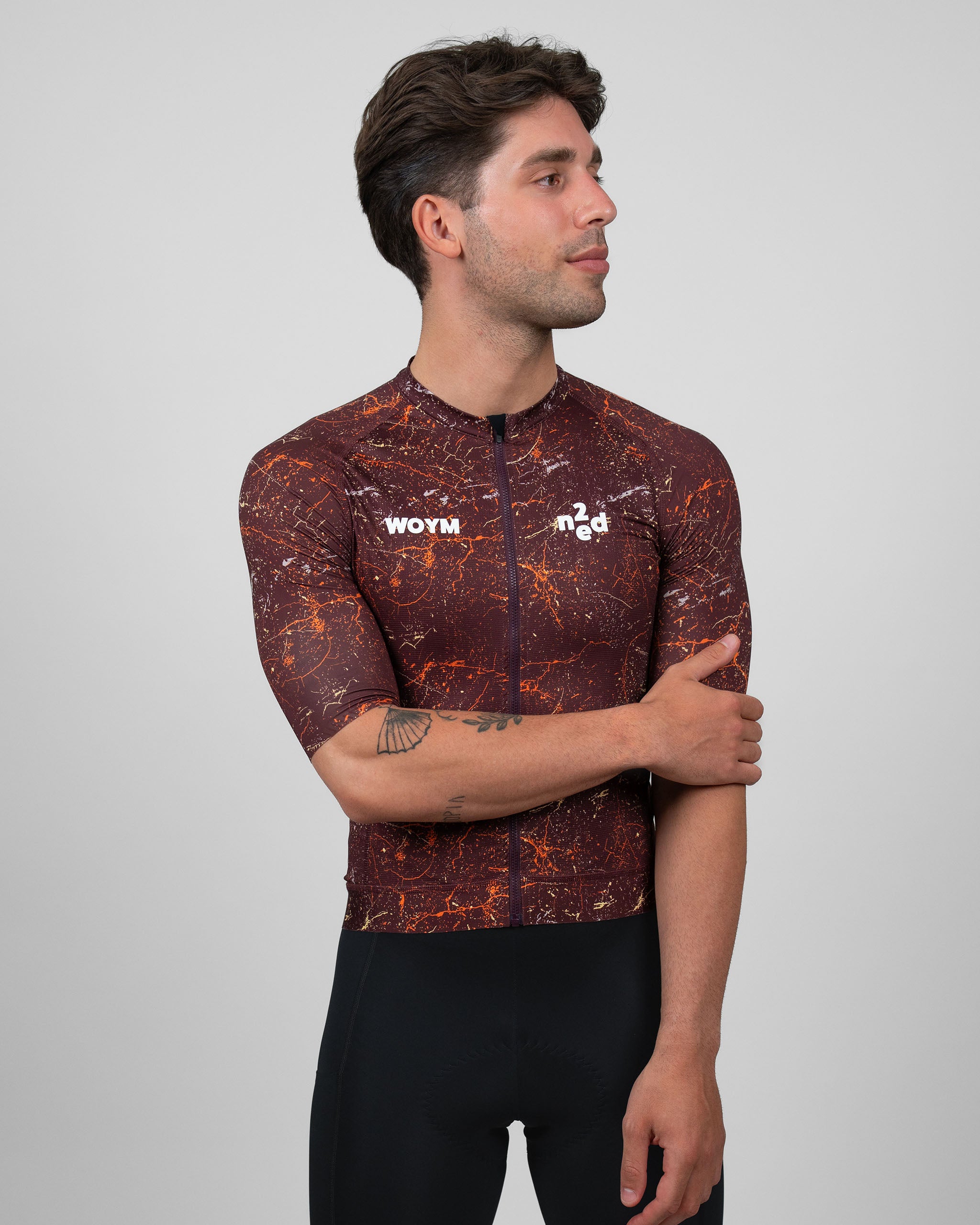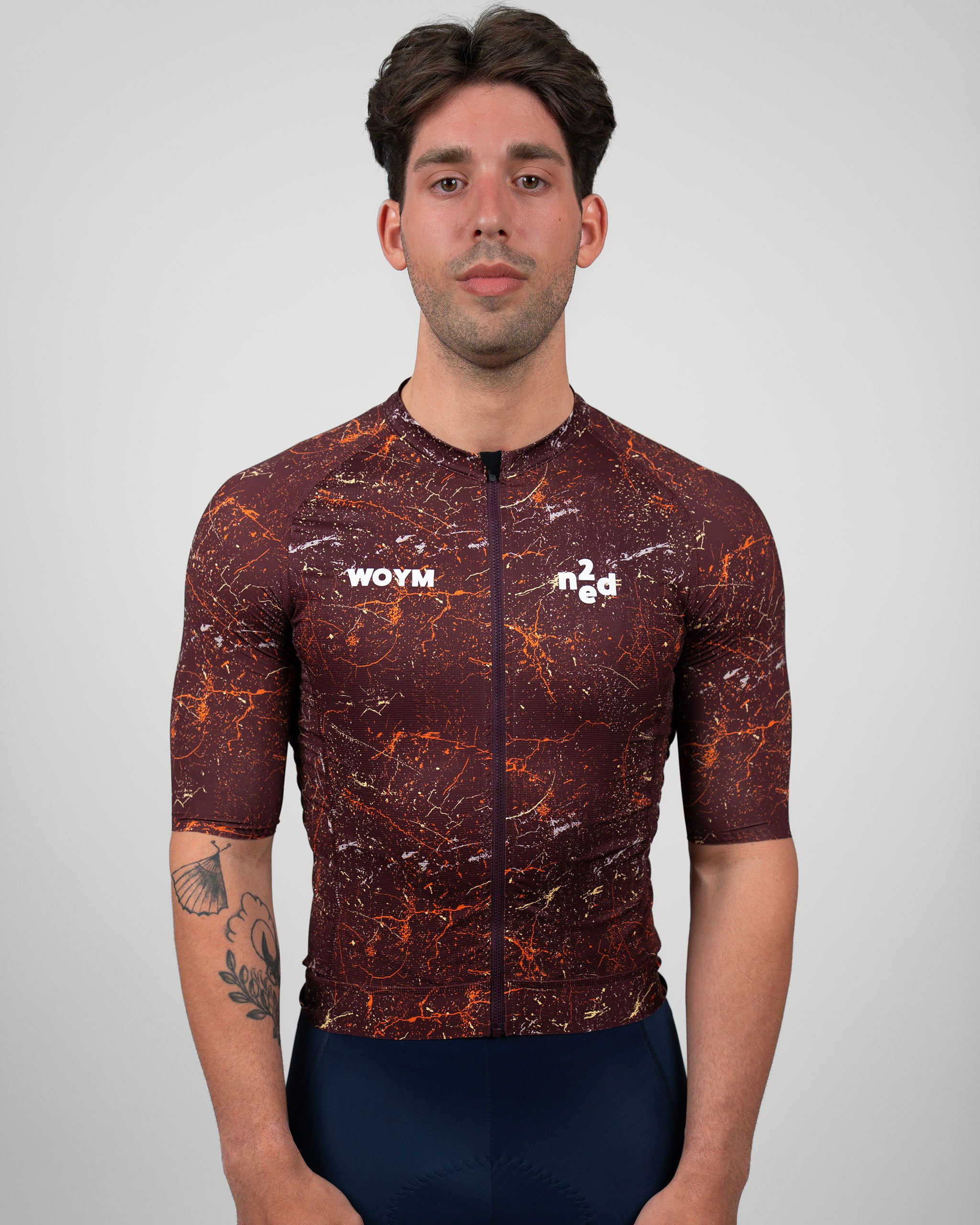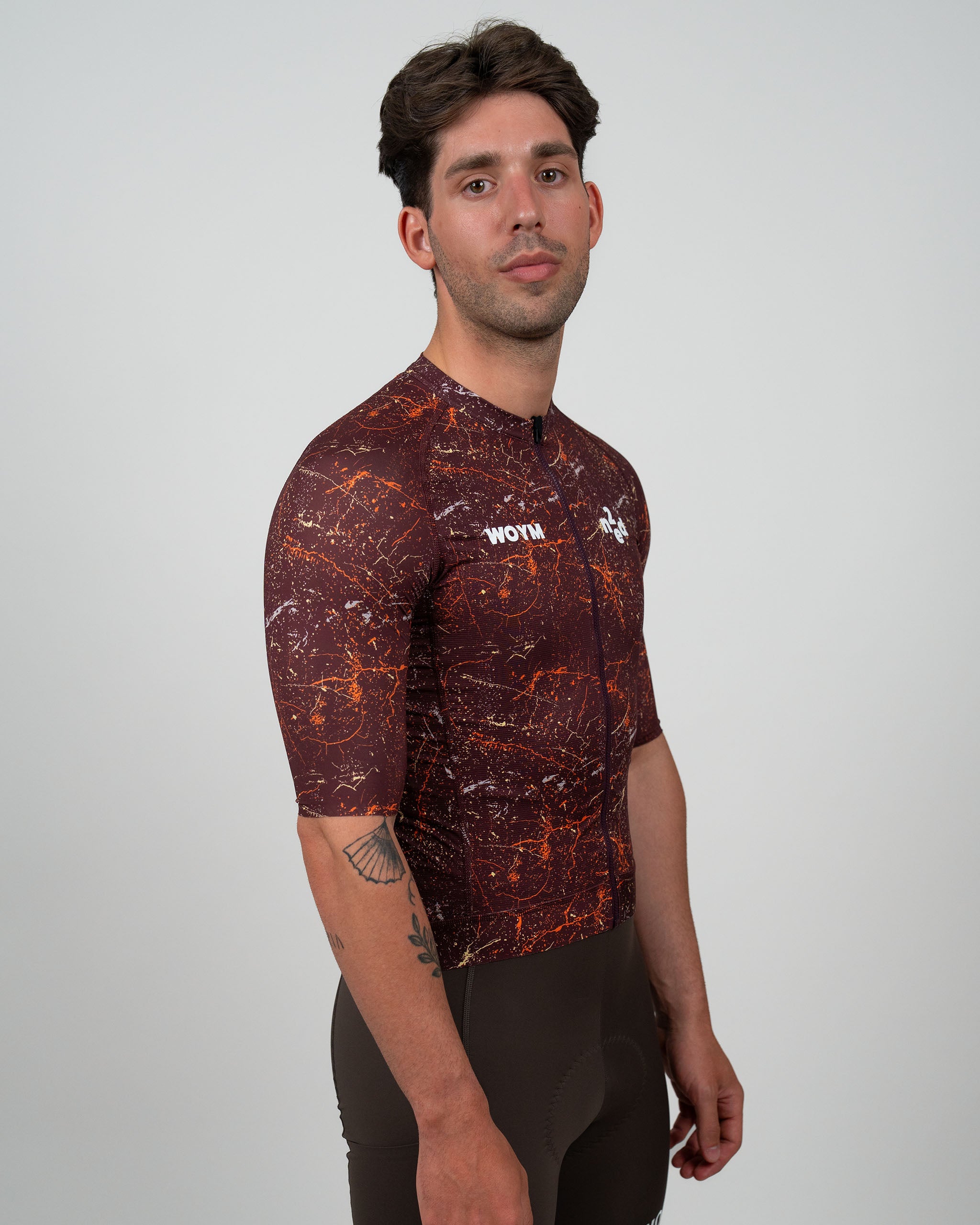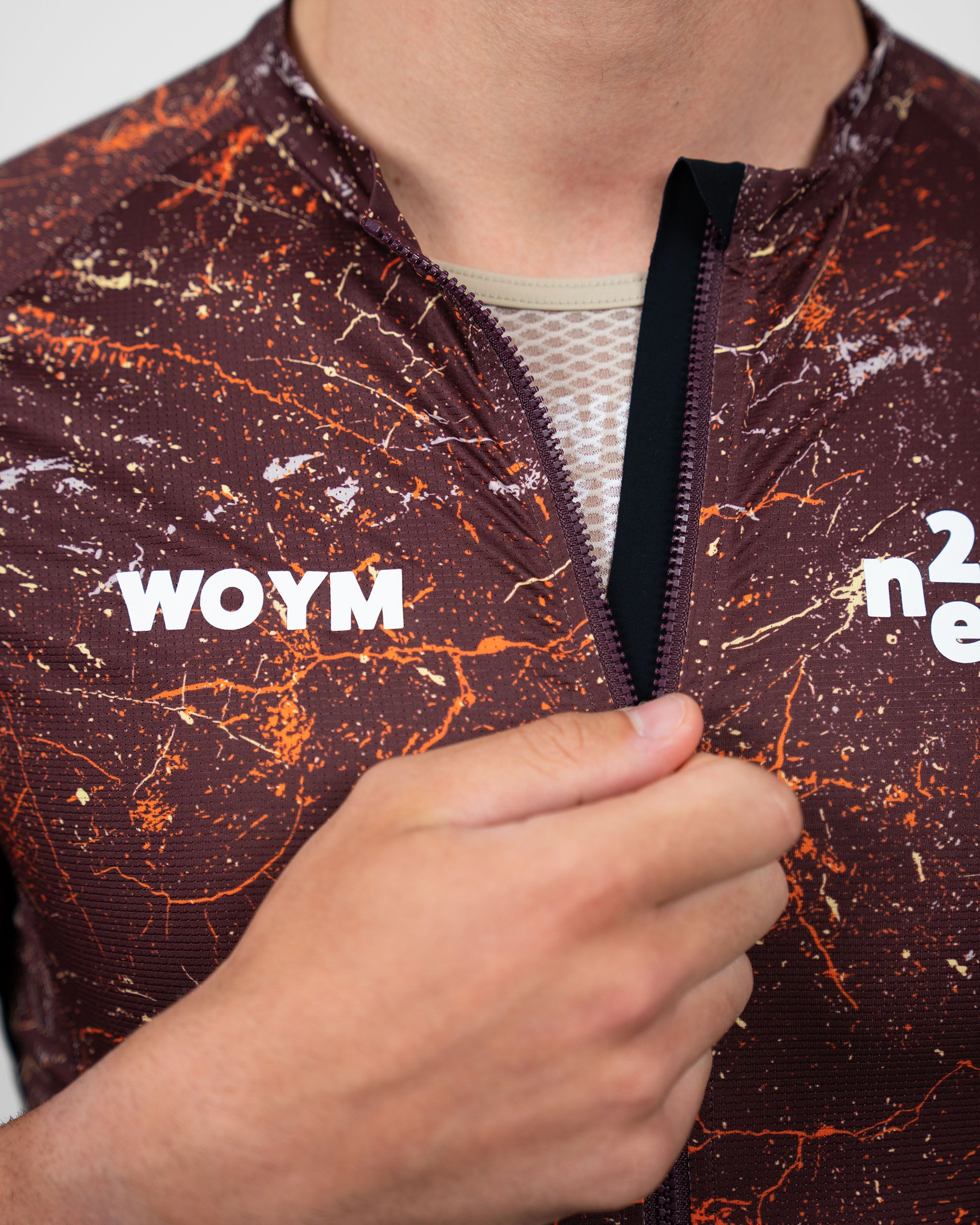 WOYM Jerseys er skabt med fokus på komfort, æstetik og personlighed. Små, men afgørende justeringer giver pasformen et tæt, men behageligt fit, der følger kroppens naturlige bevægelser uden at føles restriktivt. Kroppen er konstrueret i et letvægts mesh-materiale med åben struktur, der sikrer vedvarende ventilation og nedkøling. Ærmerne har samme base, men med lukket tekstur og laserskåret afslutning. En indvendig gripper holder diskret og effektivt ærmet på plads uden at kompromittere det rene udtryk. Jerseyens bund er afsluttet med en bred, elastisk og tæt ribkant, der sikrer et stabilt fit.